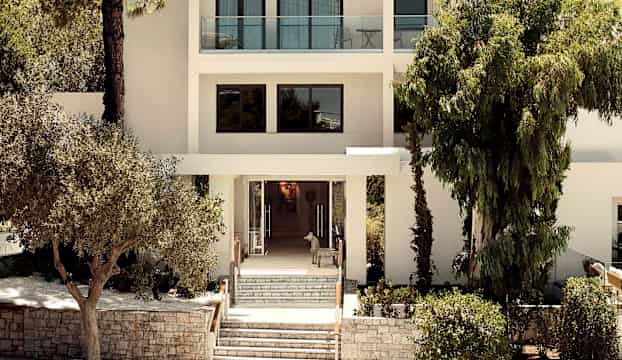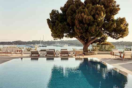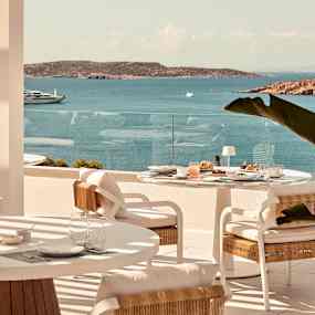 Gråmarmorerade stengångar leder vidare till hotellets infinitypool, uthuggen direkt ur Vouliagmenis klippor. Solsängar och parasoll väntar på stilla stunder, omgivna av grönskande tallar och den svalkande havsbrisen. Nedanför breder Egeiska havet ut sin djupblå spegel – perfekt för rofyllda kajakturer längs Rivierans karga klippor, där dolda grottor väntar på att upptäckas.
