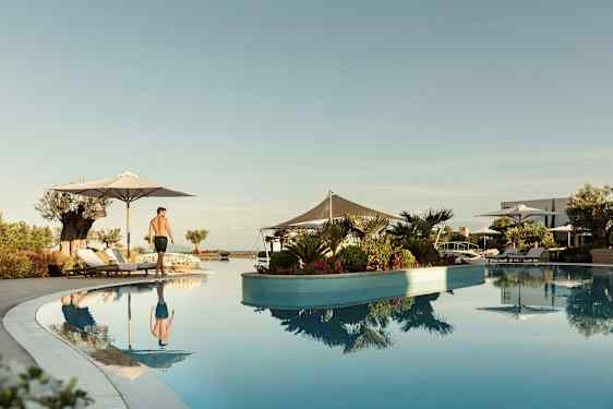 I hjärtat av Sani Resort breder Greklands största uppvärmda pool ut sig, omgiven av eleganta solstolar och träbroar. En slingrande stig leder ner till den privata stranden, där sju kilometer sand möter havet. Här väntar skuggande parasoller, perfekta för avkoppling till ljudet av vågornas mjuka brus. Vid vattensportcentret guppar kajaker på havsytan medan segel fångar vinden. Utbudet sträcker sig från katamaransegling och vindsurfing till wakeboarding, vattenskidåkning och parasailing – en värld av äventyr för den som älskar havet.