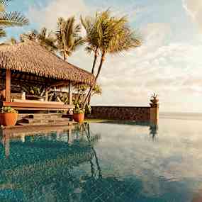 Poolområdet breder ut sig mellan lummiga trädgårdar och havets vidöppna horisont. Tre pooler vilar sida vid sida – spegelblanka trappsteg leder blicken mot Indiska oceanens djupblå rand, där ljuset skiftar från morgon till kväll. Mjuka solstolar står utspridda i palmernas skugga, en inbjudande plats för stilla stunder med en bok i handen eller ett glas från poolbaren. Endast vågornas rytm och vindens lek i bladen bryter tystnaden.