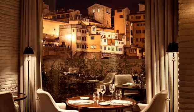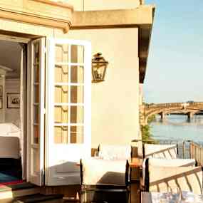 Hotel Lungarno ligger intill Arnofloden, med Ponte Vecchio och stadens historiska kvarter strax utanför. Här möter en avslappnad färgpalett i blått, vitt och brunt en omfattande konstsamling med 450 verk som sträcker sig genom hela hotellet och ger rummen och sviterna en konstnärlig identitet där flera av dem är tillägnade enskilda konstnärer.