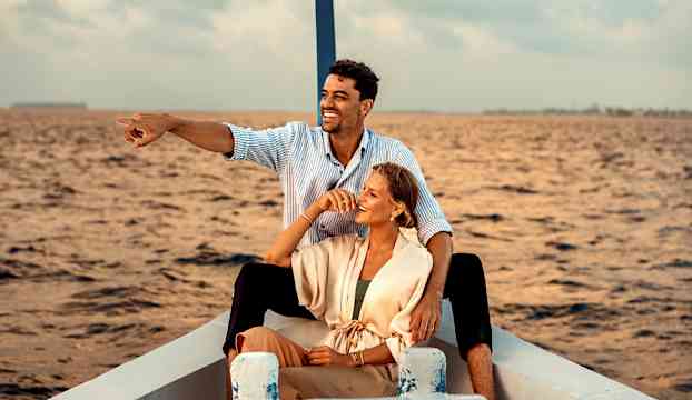 När kvällen närmar sig tänds mjuka ljus över lagunen. Du har något svalkande i glaset, låter fötterna vila mot den ljumma trätrallen, och njuter av en omsorgsfull service från personalen.