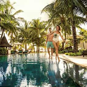 Poolområdena är strategiskt placerade för att erbjuda både social samvaro eller för dig som söker stillhet och sinnesro. Från den centrala huvudpoolen blickar du ut över det stillsamma havet, medan de mindre, uppvärmda poolerna ligger inbäddade bland gröna kokospalmer, tätt intill sviterna. Promenera ner till den långa vita stranden, där vågornas rytm möter besökare som väljer mellan vattensporter, en lugn promenad eller en stilla stund i skuggan från ett parasoll.