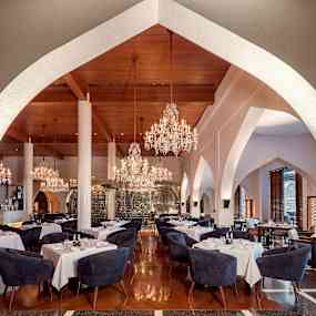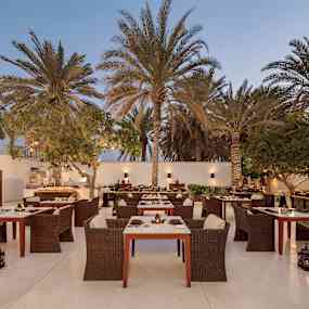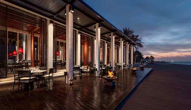 Hotellets fem restauranger bjuder på en internationell smakresa. The Restaurant serverar rätter från hela världen under glittrande kristallkronor, The Beach Restaurant förfinar havets skatter med havsutsikt och varje pool har sin egen restaurang med allt från japansk sushi till Medelhavets smaker. The Lobby Lounge erbjuder en sofistikerad miljö för kaffe, vin eller cocktails med utsikt över Omanbukten.